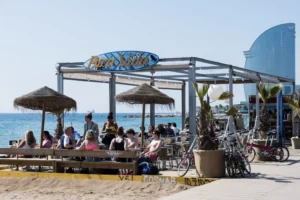 A seaside terrace in Barceloneta serving fresh seafood with open-air seating and coastal views.